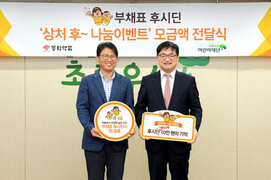 [쿠키뉴스=송병기 기자] ◎동화약품 부채표 후시딘, ‘상처 후~나눔 이벤트’ 모금액 기부=동화약품(대표이사 손지훈)은 초록우산어린이재단(회장 이제훈) 본사에서 ‘상처 후~나눔 이벤트’를 통해 조성된 모금액 전달식을 열었다.