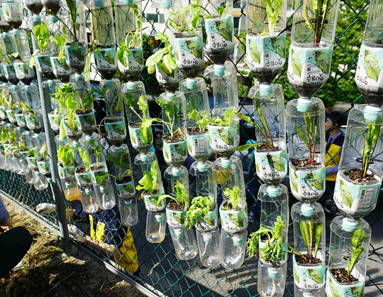 웰빙 Green Wall에 거는 벽걸이 화분으로는 페트병을 재활용했다. 수거된 웰빙헛개수 페트병 안에 CJ헬스케어 임직원들은 다양한 식물을 심고 마장동 벽화마을 펜스에 녹색정원을 만들며 구슬땀을 흘렸다.