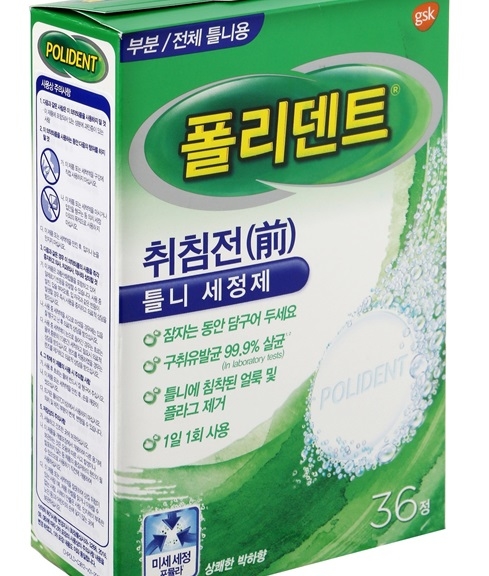 ◎GSK, 폴리덴트 ‘나이트 의치 세정제’ 출시…‘취침 전 한 알로 틀니 관리= 치약으로 틀니를 세정할 경우 연마제가 틀니 표면에 미세한 상처를 입혀, 그 사이로 구취 또는 의치성 구내염을 유발하는 세균 및 곰팡이균(Candida albicans)의 번식이 일어날 수 있는 것으로 알려져 있다.