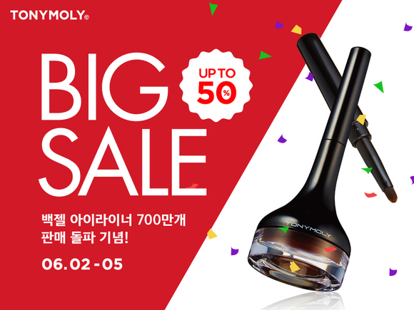 [쿠키뉴스=구현화 기자] 토니모리는 국민 아이템 ‘백젤 아이라이너’의 700만 개 판매 돌파를 기념해 2일부터 5일까지 총 4일 간 최대 50%까지 할인하는 6월 빅세일(BIG SALE)을 진행한다.