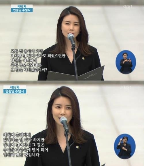 이날 이보영은 현충일 추념식 추모 공연 2막에서 추모의 마음을 담아 담담하게 유연숙 작가의 '넋은 별이 되고'를 낭독했다. 이외에도 이날 추념식에는 장사익이 추모 공연을 펼쳐 화제가 됐다.