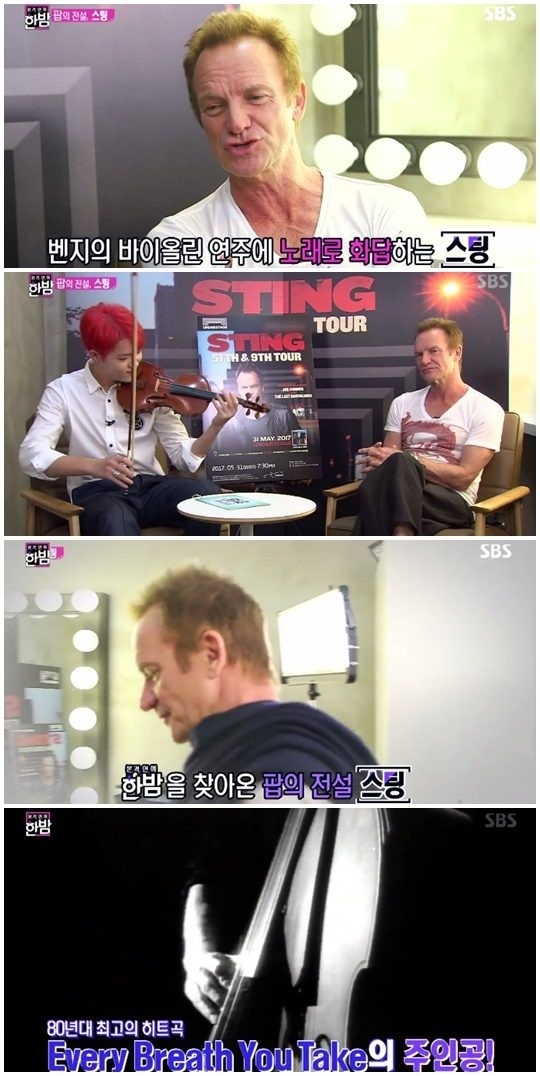 6일 방송된 SBS ‘본격연예 한밤’에서는 벤지가 뮤지션 스팅과의 인터뷰를 진행했다. 스팅은 1996년을 시작으로 최근 다섯 번째 한국에 방문했으며, 현대카드의 초청으로 최근 현대카드 라이브러리에서 소극장 공연을 진행했다.