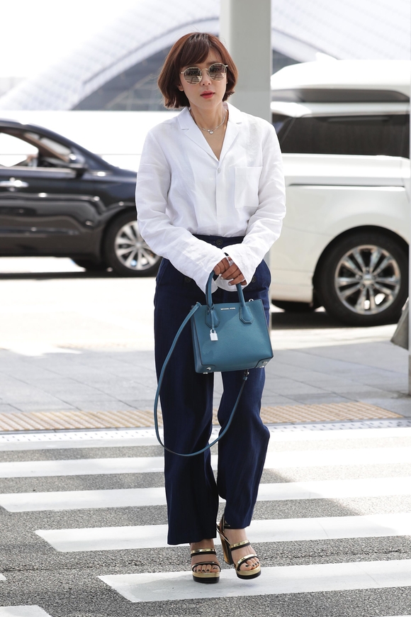 최강희는 이날 화이트 셔츠에 네이비 컬러의 데님 부츠컷 팬츠을 매치해 세련된 공항패션을 선보였다.