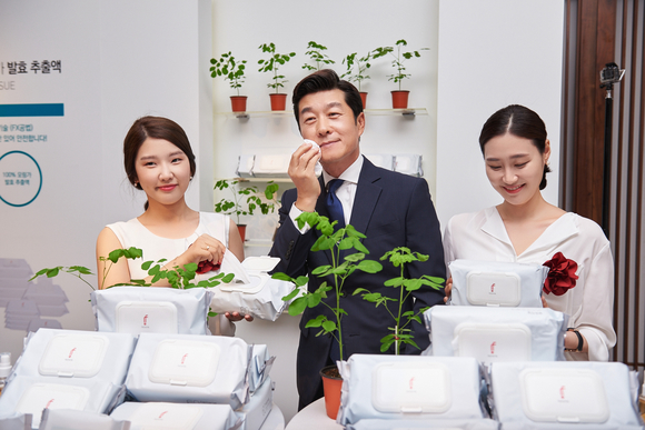 20일 서울 중구 신라호텔 영빈관에서 팩토리얼 론칭 행사 및 기자간담회를 갖고 이동열 대표가 직접 화학 성분 대신 100% 모링가 발효 추출액만 함유된 '모링가 물티슈'를 처음으로 선보였다.