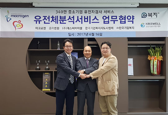 ◎마크로젠·한국기업복지·조이병원, 질병예측 개인유전체 분석 서비스 3자 협약 체결=마크로젠(대표이사 정현용) 한국기업복지(대표이사 이현호), 조이병원(대표원장 조성호)은 최근 ‘340만 중소기업 임직원을 위한 질병예측 유전체 분석 및 빅데이터 구축 사업’을 위한 3자 협력 양해각서를 체결했다.