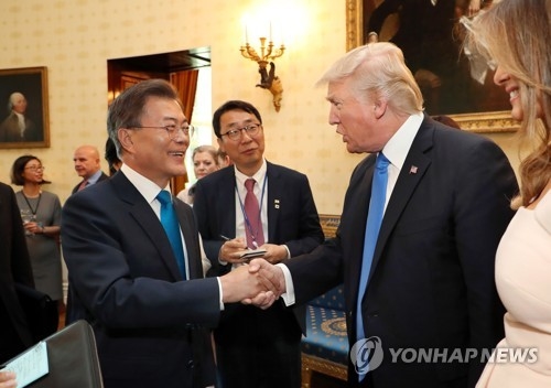 [쿠키뉴스=박효상 기자] 문재인 대통령과 도널드 트럼프 미국 대통령이 29일 오후(현지시간) 워싱턴 백악관에서 열린 환영 만찬에서 밝은 표정으로 대화하고 있다.