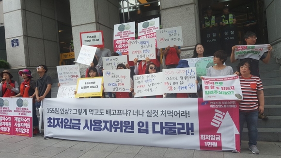 민주노총 서비스연맹은 3일 오후 2시 서울역 인근 메트로타워 앞에서 최저임금 155원 인상안을 제시한 최저임금위원회 사용자위원에 대한 규탄 기자회견을 가졌다. 이날 최저임금위원회는 오후 3시에 서울역 인근에서 7차 전원회의를 소집해 이에 앞서 시위를 연 것이다.
