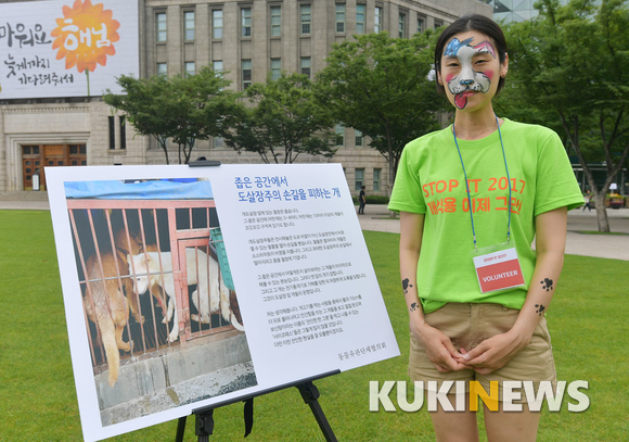 [쿠키뉴스=박효상 기자] 9일 오후 서울 태평로1가 서울광장에서 열린 'STOP IT 2017(스탑 잇 2017)' 행사에서 자원봉사자가 포즈를 취하고 있다.