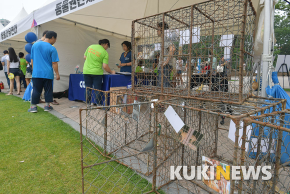 [쿠키뉴스=박효상 기자] 9일 오후 서울 태평로1가 서울광장에서 열린 'STOP IT 2017(스탑 잇 2017)' 행사 동물권단체 케어 부스에 식용개 철장이 전시됐다.