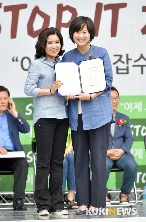 [쿠키뉴스=박효상 기자] 정의당 이정미 의원이 9일 오후 서울 태평로1가 서울광장에서 열린 'STOP IT 2017(스탑 잇 2017)' 행사에서 동물보호명예지킴이에 위촉됐다.