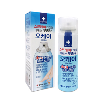 오케이에어로솔은 연고 및 크림 형태의 환부에 직접 바르는 무좀치료제의 사용시 불편함을 개선한 신개념 제품으로 양말이나 스타킹 위, 신발 안에 직접 분사 하여도 되는 이상적인 무좀치료제다.