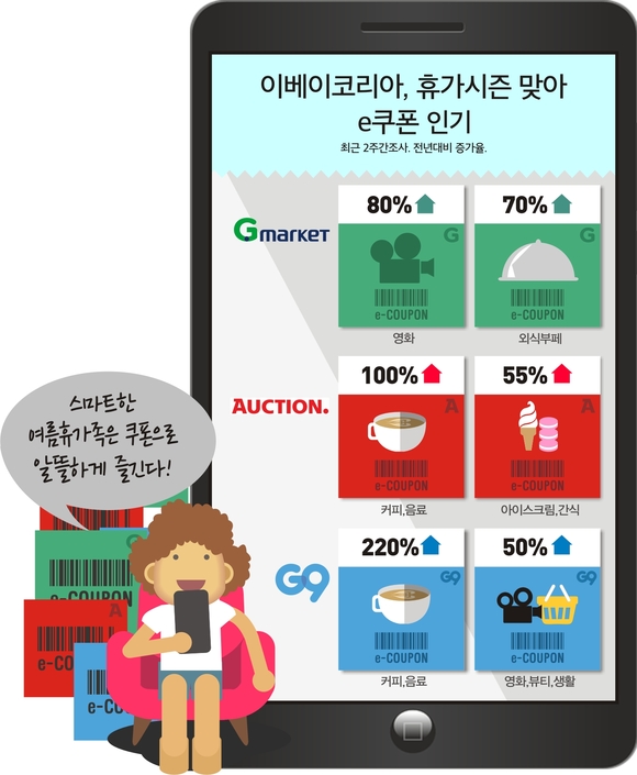 G마켓과 옥션, G9를 운영하는 국내 1위 전자상거래 기업 이베이코리아가 휴가 시즌을 맞아 e쿠폰 상품 판매량을 조사한 결과 전년 동기 대비 최대 3배 이상 증가한 것으로 나타났다.