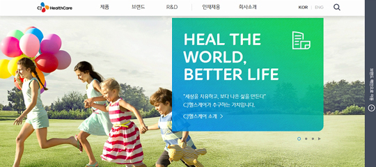 CJ헬스케어 홈페이지는 2013년 이후 새롭게 개편한 것으로, 메인 화면을 회사 중심과 브랜드 중심 등 2가지 버전으로 제작해 일반인, 전문가 고객 누구든지 원하는 정보에 빠르게 접근할 수 있도록 했다.