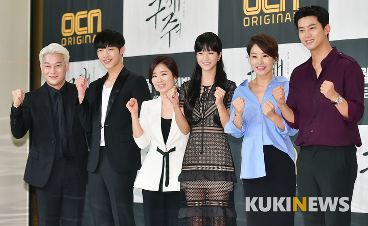 [쿠키뉴스=박효상 기자] 배우 조성하와 우도환, 윤유선, 서예지, 박지영, 옥택연이 27일 오후 서울 영중로 타임스퀘어 아모리스 홀에서 열린 OCN 드라마 ‘구해줘’ 제작발표회에 참석해 포즈를 취하고 있다.