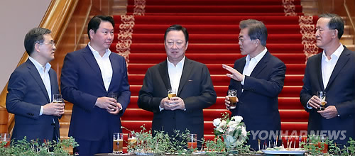 [쿠키뉴스=구현화 기자] 문재인 대통령이 28일 청와대에서 가진 기업인들과의 '칵테일 미팅'의 건배사는 '대통령, 소통, 만사형통 3통을 위하여' 였다. 문 대통령은 이날 오후 6시께 청와대 본관 로비에서 기업인 7명과 맥주 칵테일을 기울이는 '칵테일 타임'을 갖고 대화를 나눴다.
