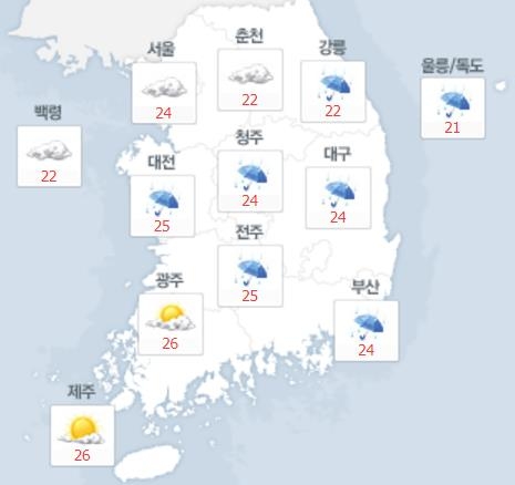 낮 예상 최고 기온은 △서울 30도 △대전 30도 △대구 28도 △전주 31도 △광주 33도 △부산 28도 △강릉 26도 △제주 32도 △울릉·독도 25도 등이다.