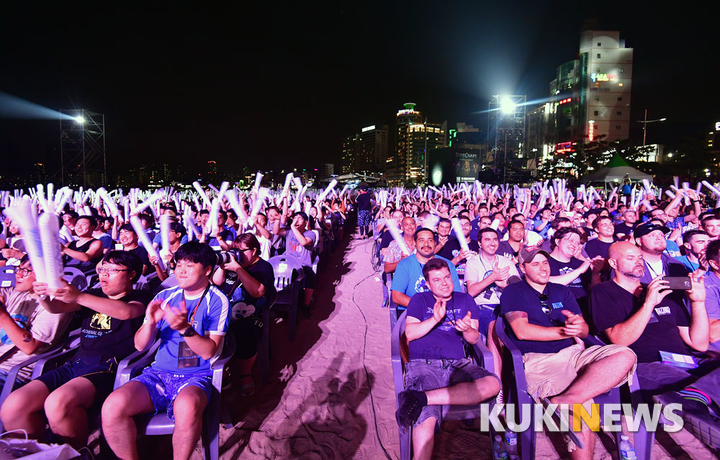 [쿠키뉴스 부산=박효상 기자] 30일 오후 부산 광안리해수욕장에서 열린 스타크래프트 리마스터 행사 '이스포츠 특별전'에서 관객이 환호하고 있다.