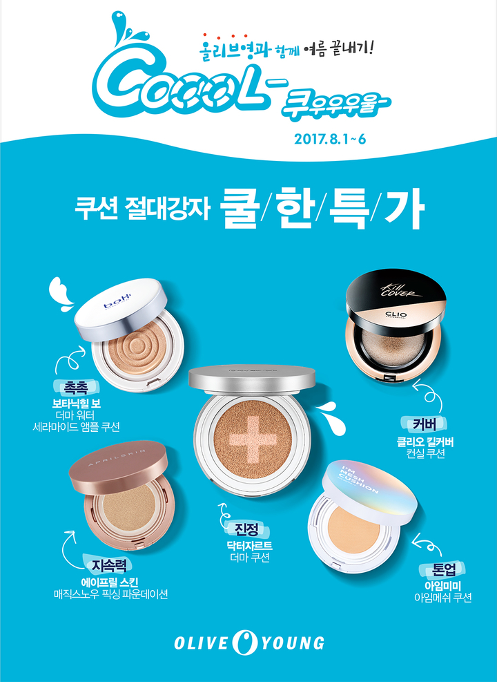 CJ올리브네트웍스가 운영하고 있는 국내 대표 헬스앤뷰티 스토어 올리브영에 따르면 가장 무더웠던 7월 한 달 간 쿠션 제품의 매출이 전년 대비 무려 115% 상승한 것으로 나타났다. 이에 올리브영은 무더운 여름철 쿠션을 선호하는 소비자 니즈에 즉각 대응해 1일부터 6일까지 ‘쿠션 대전’을 콘셉트로 한 인기 쿠션 기획전을 실시한다고 1일 밝혔다.