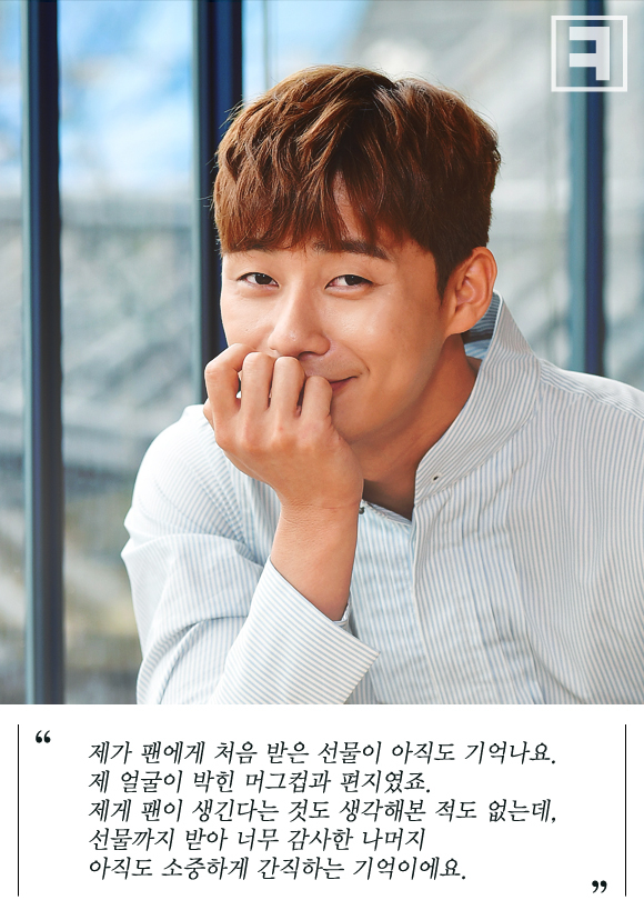 “제가 팬에게 처음 받은 선물이 아직도 기억나요. 제 얼굴이 박힌 머그컵과 편지였죠. 제게 팬이 생긴다는 것도 생각해본 적도 없는데, 선물까지 받아 너무 감사한 나머지 아직도 소중하게 간직하는 기억이에요.”
