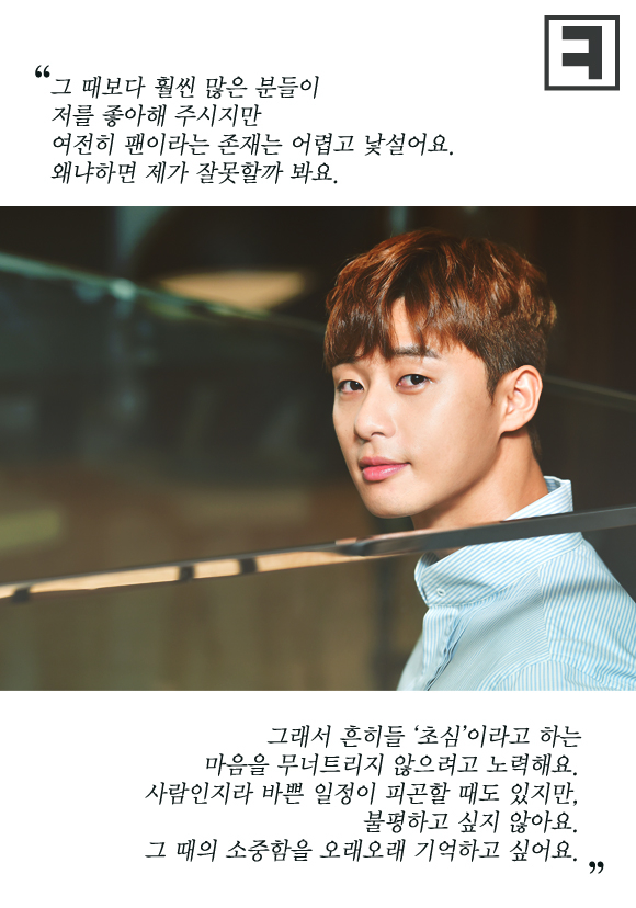 지망생 시절과는 모든 것이 다르다. 그럼에도 변하지 않은 것이 있을까. 박서준은 “연기를 대하는 마음가짐만은 변하지 않는 것 같다”고 말했다. 이른바 ‘초심’이다.