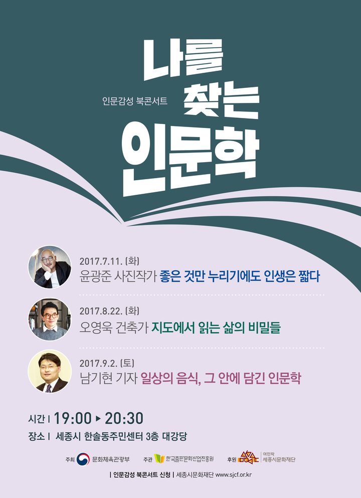‘나를 찾는 인문학, 인문감성 북콘서트’는 책과 음악, 인문학이 어우러진 고품격 북콘서트로 매월 세종시에서 개최되며 9월(독서대전)과 10월(세종 어린이 책 축제)은 특별 강연으로 개최된다.