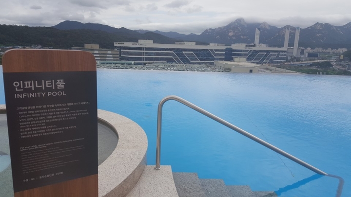 마치 발리 같은 해외 리조트에 온 듯한 느낌이 드는 휴식공간과 함께 작은 키즈풀이 마련돼 있었다. 옆으로 조금 더 가면 하늘과 이어진 듯한 느낌을 주는 인피니티풀이 북한산의 풍광을 바탕으로 눈앞에 펼쳐졌다.