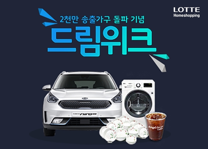 롯데홈쇼핑은 데이터홈쇼핑 ‘롯데OneTV’의 시청 가구 수 2000만 돌파를 기념해 자동차, 건조기 등 다양한 경품을 증정하는 ‘드림위크’ 이벤트를 실시한다. 이달 21일부터 3주 간 ‘롯데OneTV’ 구매고객을 대상으로 다양한 할인 혜택과 경품을 제공한다. 해당 기간 동안 ‘롯데OneTV’ 앱, 웹사이트, 리모컨을 통해 상품을 구입한 고객에게 10% 할인쿠폰, 구매금액의 10%를 적립금으로 제공한다. 또, 경품 이벤트에 응모한 고객 중 추첨을 통해 기아자동차의 2018년형 ‘니로 하이브리드 자동차(1등/1명)’를 경품으로 증정하고, 세컨드 가전이자 최근 주부들의 필수 가전으로 꼽히는 ‘LG트롬 전기식 빨래건조기(2등/3명)’, ‘코렐 10인 홈세트(3등/10명)’, ‘모바일 커피교환권(2천명)’을 경품으로 제공한다. 당첨자는 내달 25일(월) 해당 이벤트 페이지를 통해 발표할 예정이다.