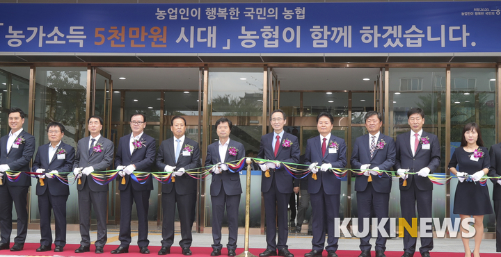 20일 전주시 효자동 NH농협 전북통합청사에서 열린 전북농협본부 신청사 준공식에 송하진 도지사와 김승환 전라북도 교육감, 김병원 농협회장, 강태호 농협본부장을 비롯한 참석자들이 농협청사 준공 테잎컷팅을 하고 있다