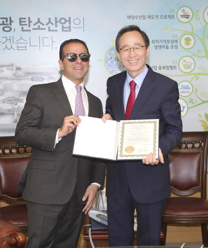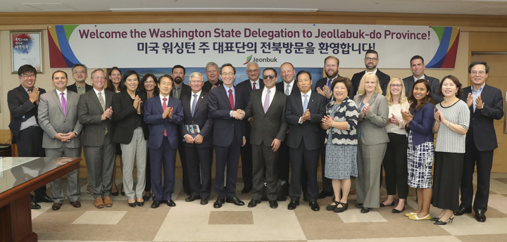20일 전라북도와 자매 결연을 맺고 있는 미국 워싱턴 주정부 사이러스 하비브 부지사를 비롯 프로트 상원의원 및 현지 기업인등 방문단이 전북도를 공식 방문한 가운데 하비브 부지사가 송하진 도지사에게 감사장을 전달하고 있다.