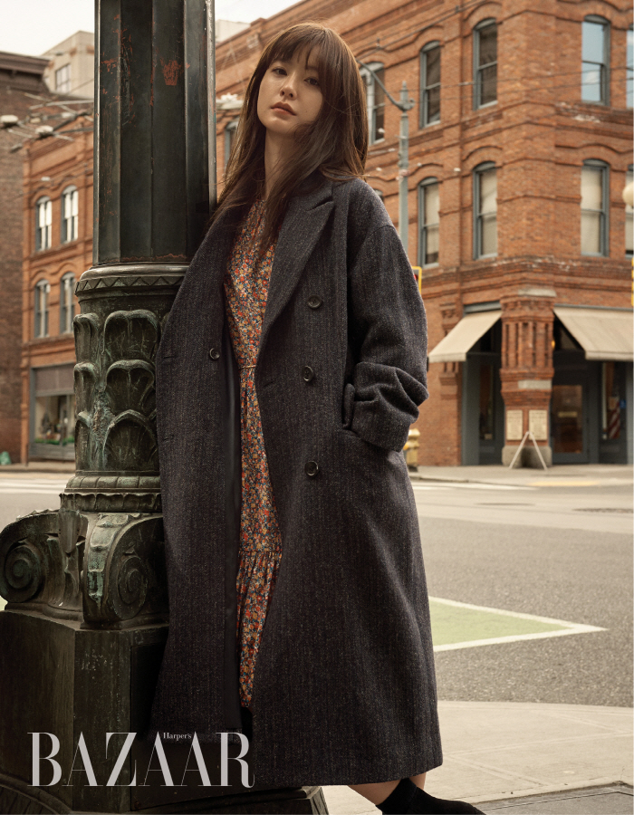 프렌치 디자이너 브랜드 '바네사브루노'와 함께한 이번 화보에서 정유미는 가을의 정취를 담아낸 서정적인 분위기를 연출했다.
