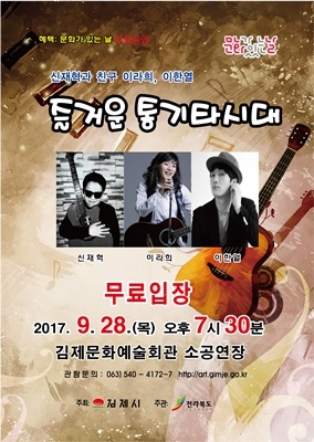 김제시가 매월 마지막 주 수요일에 시행하는 문화가 있는 날 9월 공연이 오는 28일 오후 7시 30분 김제문화예술회관 소 공연장에서 ‘즐거운 통기타 시대’로 찾아온다.