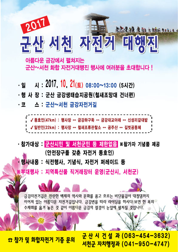 양 시・군에 위치해 있는 ‘금강자 전거길’에서 진행되는 이번 자전거 대행진은 군산 철새 조망대 건너편 행사장에서 웅포대교까지 왕복 47km 거리의 동호인 코스와 행사장에서 출발해 원나포 공주산까지 왕복 22km 거리의 일반인 코스로 나뉘어 운영된다.