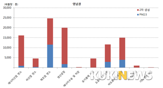 영남 내 오염물질 배출 비율을 살펴보면 영남권의 특징이 드러난다고 전하며, 배출비중이 높은 배출원 순은 ▶제조업연소 2만4614톤(25.2%) ▶생산 공정 1만9949톤(20.4%) ▶에너지산업 연소 1만6115톤(16.5%) ▶비도로이동오염원 1만5007톤(15.4%) 등이었다.