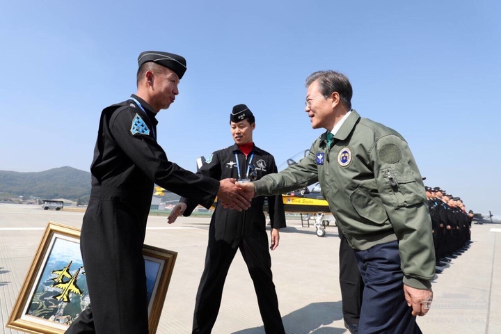 문재인 대통령이 17일 오전 성남 서울공항에서 열린 ’서울 ADEX 2017’ 국제 항공우주 및 방위산업 전시회 개막식에서 멋진 시험비행을 보인 블랙이글스 조종사와 정비사들을 격려하고 있다.
