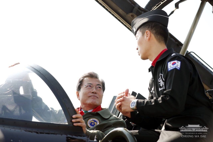 문재인 대통령이 17일 오전 성남 서울공항에서 열린 ’서울 ADEX 2017’ 국제 항공우주 및 방위산업 전시회 개막식에서 블랙이글스에 올라타 조종사의 설명을 듣고 있다.