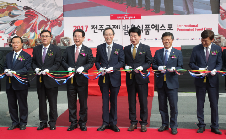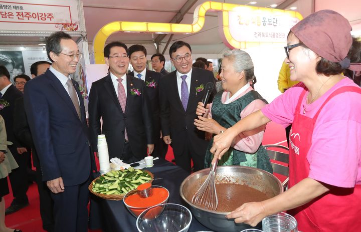 전주 월드컵경기장에서 열린 제15회 전주국제발효식품엑스포 개막식에 김영록 농식품부장관과 송하진도지사, 황현 전라북도의회 의장를 비롯한 참석자들이 행사장 부스를 돌며 발효 식품을 둘러보고 있다.