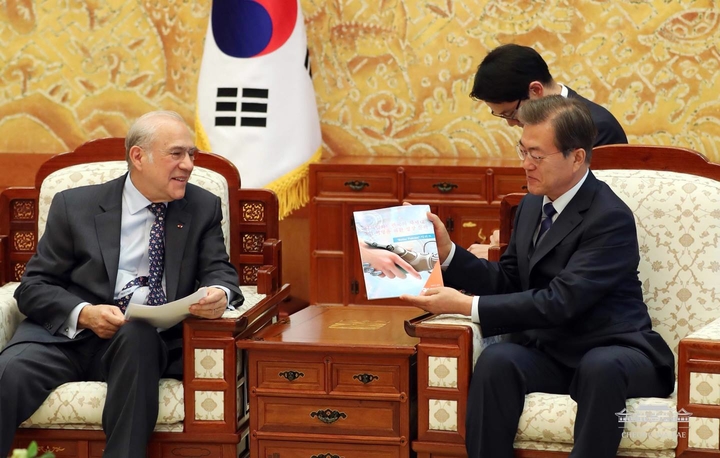 문재인 대통령이 19일 오후 청와대에서 방한 중인 앙헬 구리아 OECD 사무총장을 만나 이야기를 나누고 있다. 이날 문 대통령과 구리아 사무총장은 포용적 성장, 일자리 창출, 디지털화, 고령화 사회 대응 등 주요 현안에 대한 의견을 교환했다.