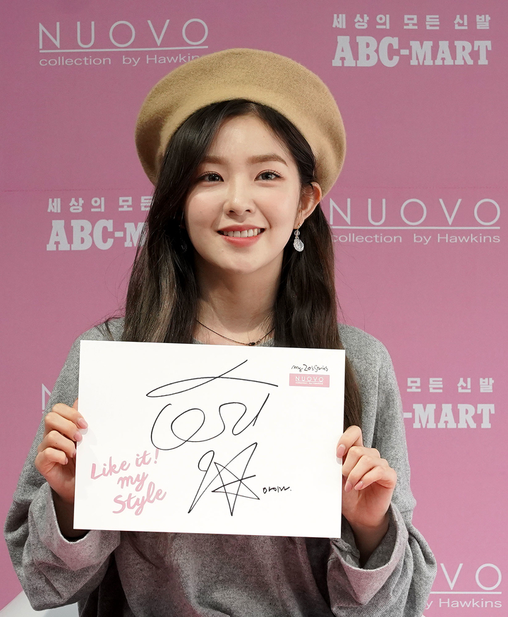 레드벨벳 아이린이 21일 서울 마포구 ABC마트 그랜드스테이지 홍대에서 열린 누오보 코코린 출시 기념 팬사인회 행사에서 포즈를 취하고 있다.