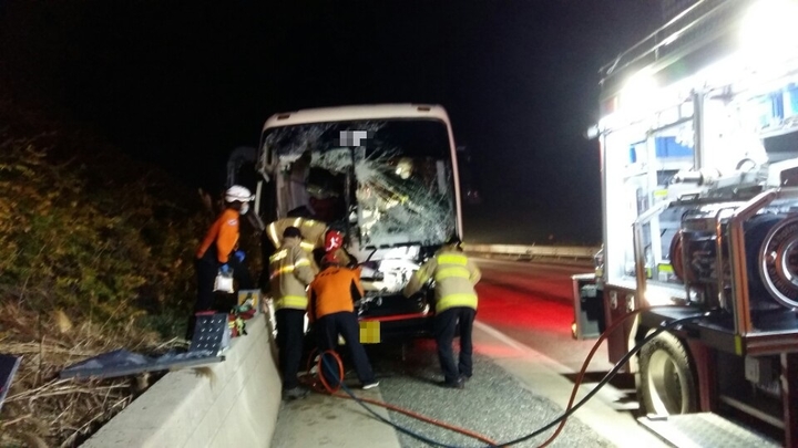 24일 오후 8시17분 전북 진안군 익산-장수간 고속도로 상행 32k 부근에서 조모(57)씨가 몰던 고속버스가 앞서가던 4.5t 트럭을 들이받았다.