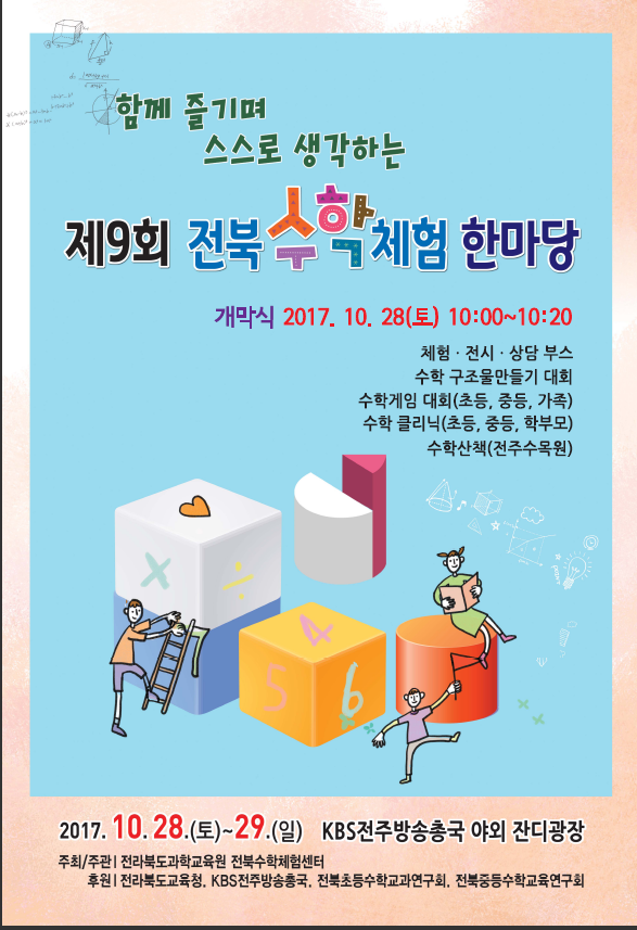 ‘함께 즐기며 스스로 생각하는 수학’을 주제로 열리는 이번 한마당은 전라북도교학교육원 전북수학체험센터가 주최 및 주관을 하고, 전라북도교육청, KBS전주방송총국, 전북초등수학교과연구회, 전북중등수학교육연구회가 후원했다.