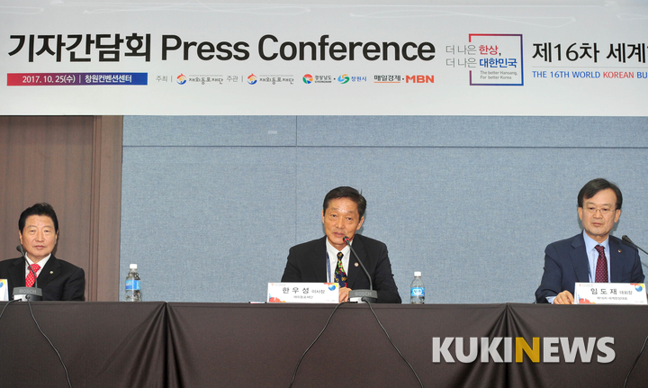 안상수 창원시장, 한우성 재외동포재단 이사장, 임도재 한상대회장이 25일 경남 창원컨벤션센터에서 열린 ‘제16차 세계한상대회’에서 취재진의 질문에 답하고 있다.