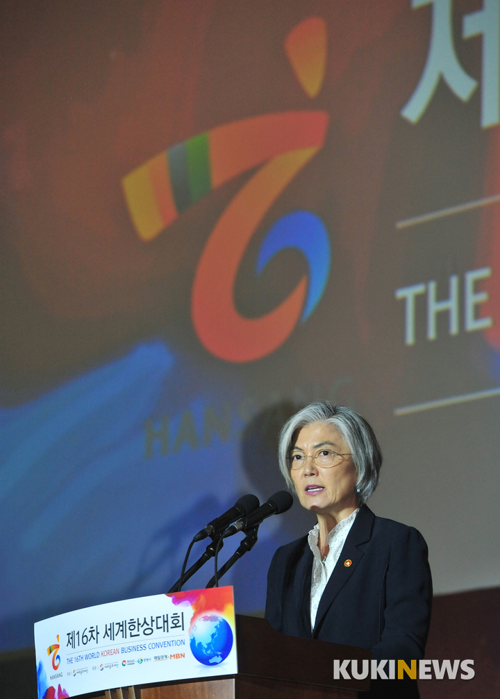 강경화 외교부 장관이 25일 경남 창원컨벤션센터에서 열린 ‘제16차 세계한상대회’ 개회식에서 축사하고 있다.