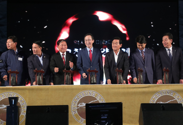 전북 고창군 고창읍성에서 열린 '제44회 고창 모양성제 개막식'에 송하진 도지사와 박우정 고창군수, 김종규 부안군수 등 참석자들이 25일 개막 타종을 하며 축제의 시작을 알리고 있다.