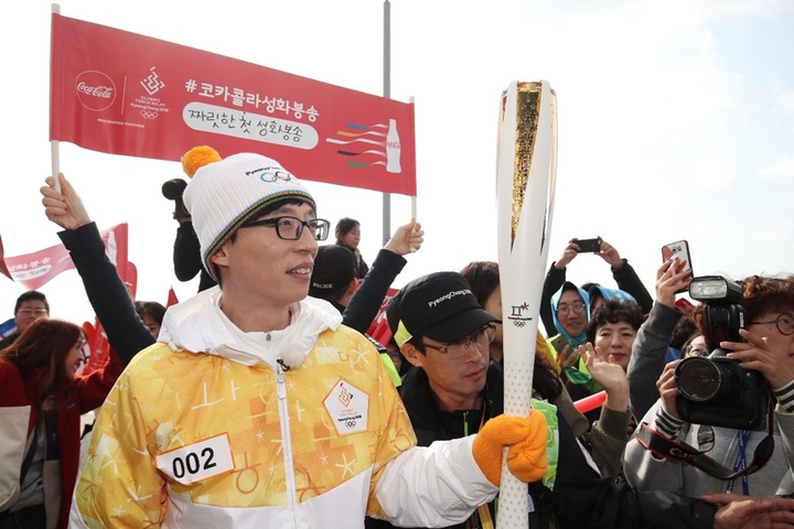 2018 평창동계올림픽 국내 성화봉송 주자인 개그맨 유재석이 1일 오후 인천 중구 인천대교에서 성화봉송을 하고 있다.