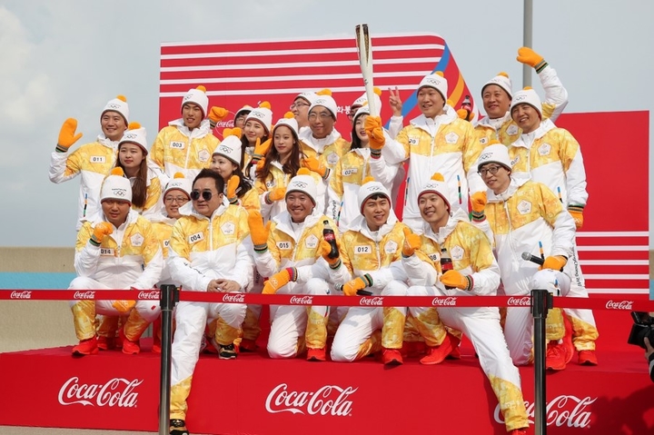 무한도전팀, 수지 등 2018 평창동계올림픽 국내 성화봉송 주자들이 1일 오후 인천 중구 인천대교에서 성화봉송 후 포즈를 취하고 있다.
