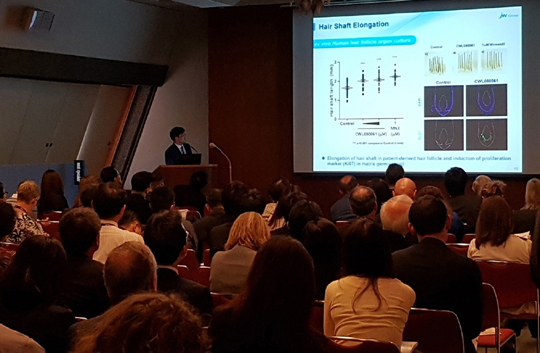 구술발표자로 나선 차주영 책임연구원은 “연구 결과 CWL080061이 Wnt 신호전달경로를 활성화시켜 모낭의 신생성을 증가시키는 결과를 확인했으며, 기존 탈모치료제 대비 동등 이상의 발모 효과가 있다는 것을 알 수 있었다”며 “탈모 환자 유래 모낭 조직을 이용한 시험에서도 모발의 성장을 유의미하게 촉진시키는 것으로 나타났다”고 설명했다.