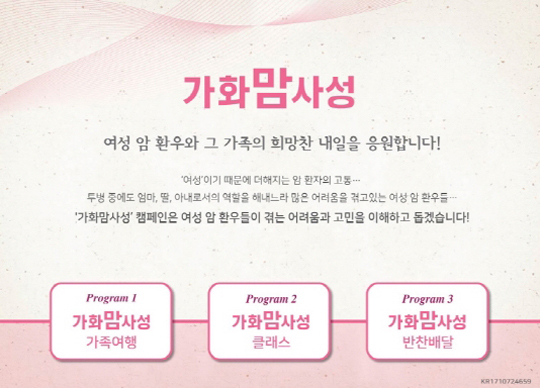 가화맘사성 캠페인은 여성 암환우가 스스로 간병하며 가족까지 돌봐야 하는 등 사회적으로 어려운 처지에 있다는 점에 착안해 여성 암환우가 가족들과 함께 마음을 치유하고 희망을 충전할 수 있도록 다채로운 프로그램을 제공한다.