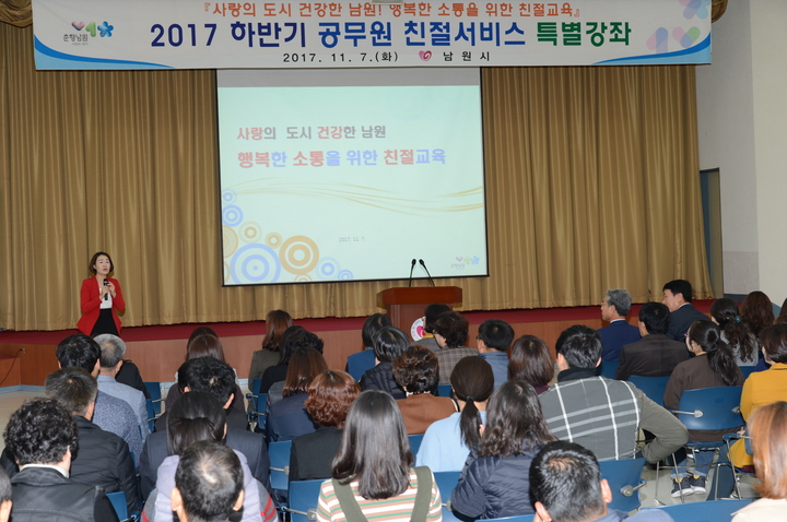 전북 남원시는 전 직원을 대상으로 고객만족 서비스 실천을 위해 '2017 하반기 공무원 친절서비스 특별 강좌'를 7일 실시했다.