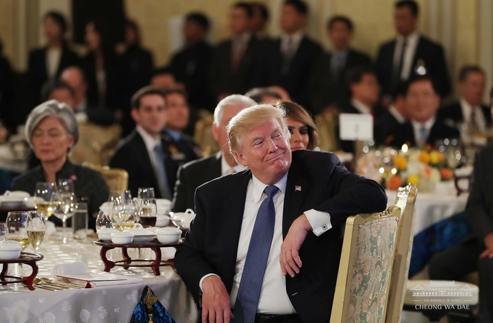 도널드 트럼프 미국 대통령이 7일 오후 청와대에서 개최된 국빈만찬에서 미소 짓고 있다.