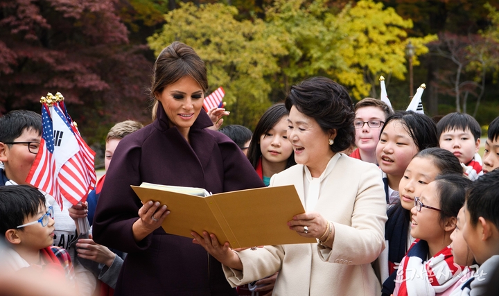 국빈방문한 멜라니아 트럼프 여사가 7일 오후 청와대를 방문해 김정숙 여사와 산책하고 있다.